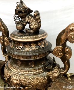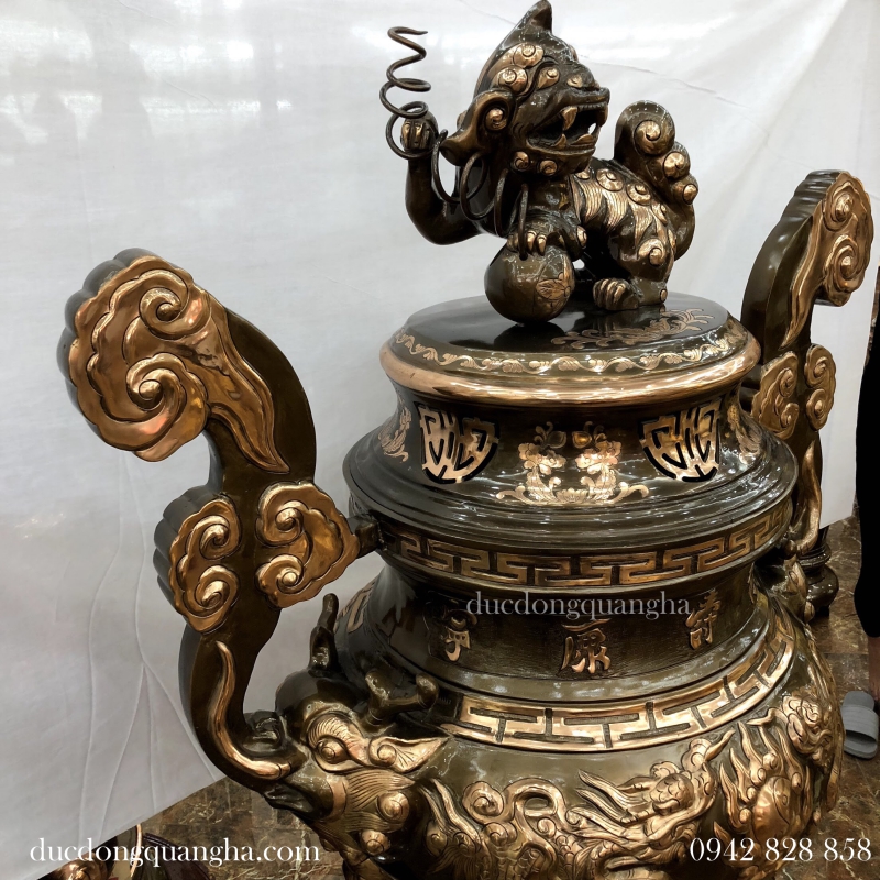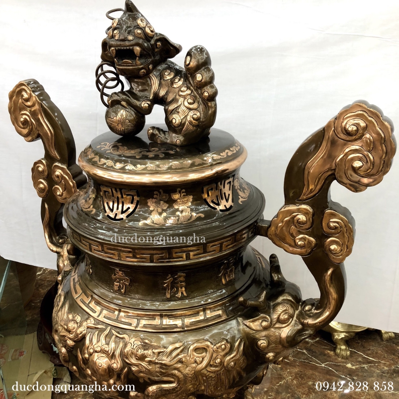 Đây là mẫu lư đúc nổi rồng chầu mặt nguyệt, tai mây, bầu lớn, miệng rộng, trông cân đối vũng trãi, tính thẩm mỹ cao. Với các mẫu lư hương ở ngoài trời thì tỷ lệ đồng chiếm khoảng 91% còn lại là có chì để dẫn chảy, thiếc tạo độ mịn về mặt của lư hương, kẽm để tạo độ cứng và độ bền cơ học.
